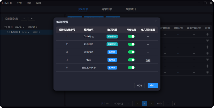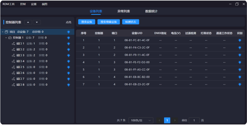 · 状态检测:全面搜索设备或快速查询新增灯具,手动获取灯具DMX地址、 运行时间、温度等状态信息。