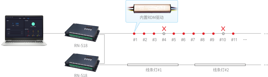 · 点亮识别:可利用点亮识别的方式快速查找对应驱动位置,可逐个或批量点亮灯具。