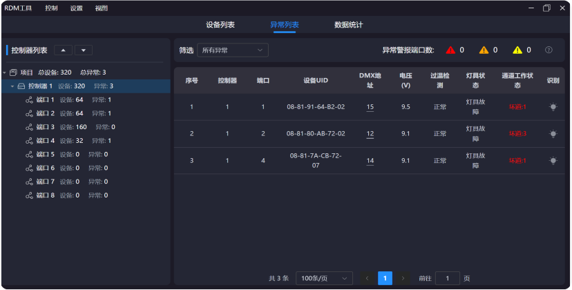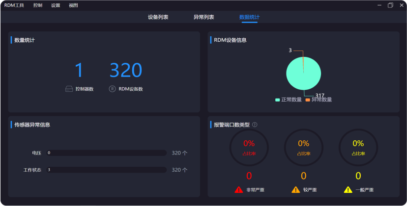 · 数据统计:可以直观地查看所有RDM设备的工作状态,包括传感器异常设备的数量,报警端口数级别占比率,RDM设备正常/异常数量、控制器/RDM设备总数。