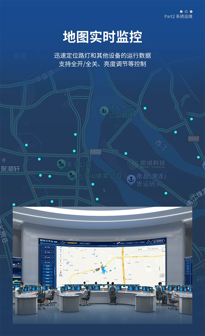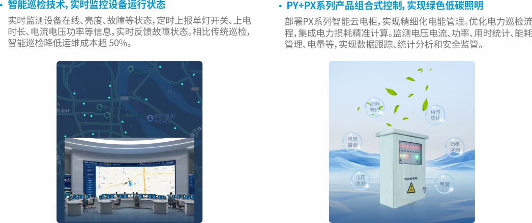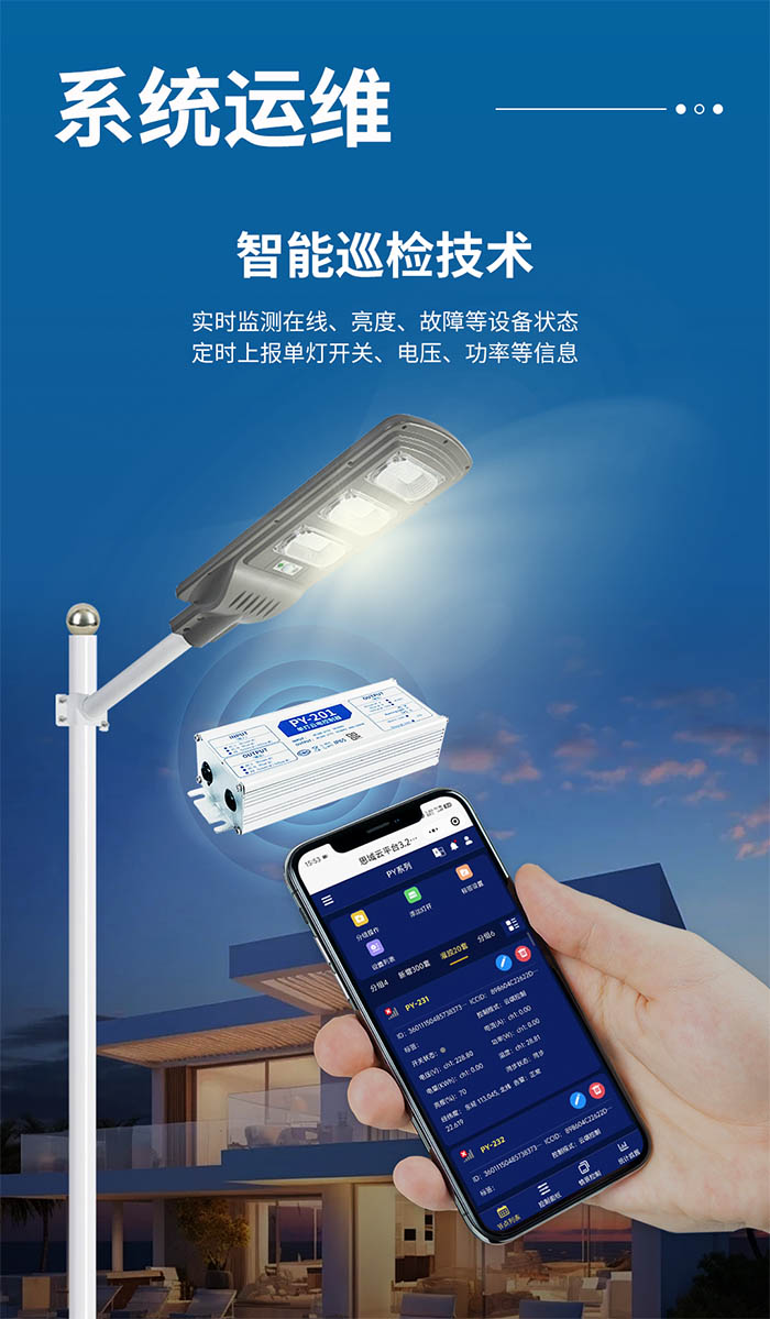 具备智能巡检技术,实时监测控制设备是否在线、亮度、故障信息等工作状态,定时上报单灯开关、上电时长、电流电压功率电能等信息,实时反馈故障状态信息。相比传统人工巡检,智能巡检技术降低运维成本达 50% 以上。