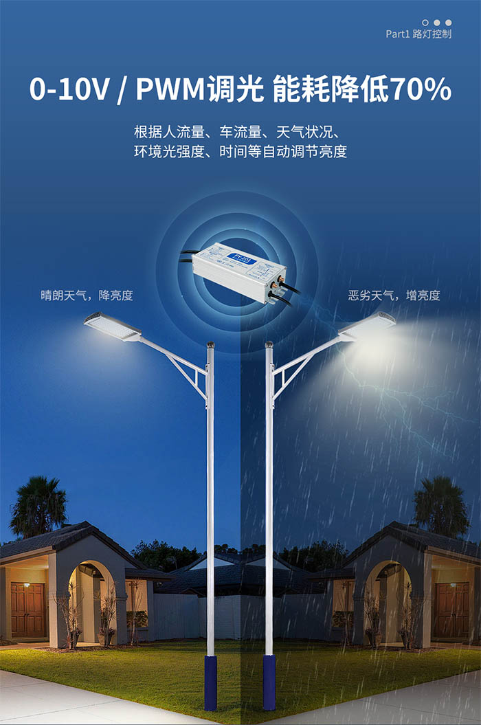 通过 0-10V/PWM 调光技术,系统可根据人流量、车流量、天气状况、环境光强度、位置、时间等因素自动调节灯光亮度,能耗降低 70% 以上。如在晴朗天气,自动降低亮度,减少能源消耗;在雾霾天气,自动增加亮度,提高行车安全。