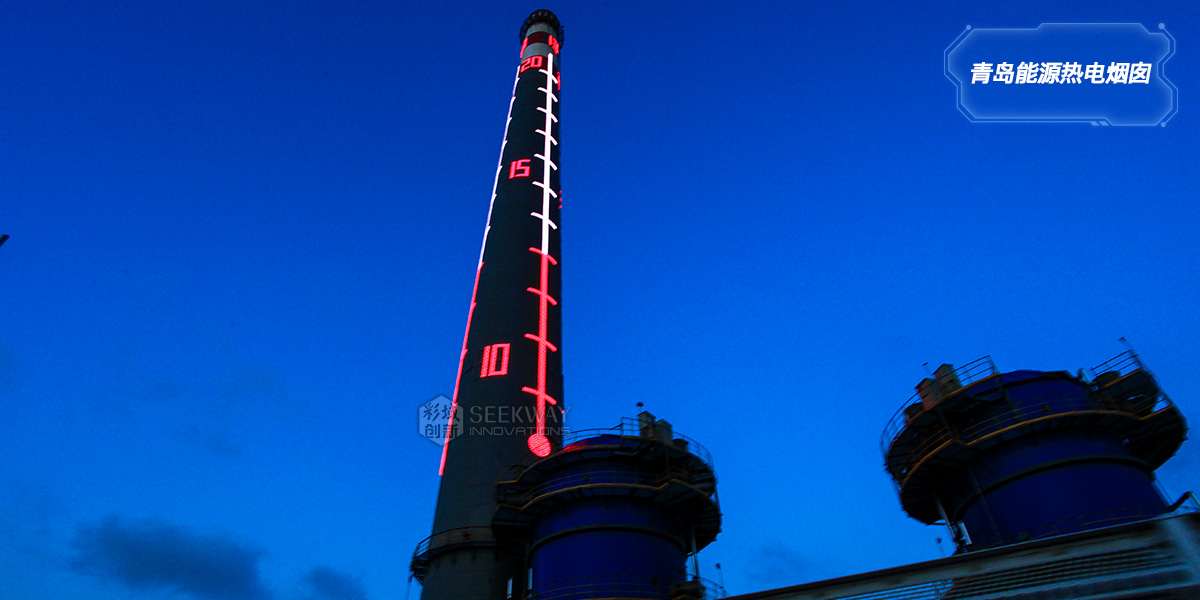 本项目是针对原有建筑展开的创意灯光改造方案,地点位于青岛市,对象为能源热电厂大型烟囱。借助一千多个DMX512点光源,在烟囱三个垂直立面上组成温度计刻度,并透过温控主控配合级联分控对应管理所有灯具。当温控模块检测到当前气温后,将实时反馈到分控同步调整指针光效,利用10格显示区间即可表现出61个区间的温度变化,减省了灯具使用量与工程费用。