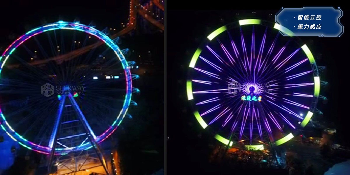 项目位于大连市森林动物公园,主要针对一座轮径长达70米的大型摩天轮进行灯光亮化,工程分为内圈18000个DMX点光源与外圈33600个DMX点光源两部分。本次控制方案的重点是确保摩天轮转动期间,内圈所有灯光效果保持正向,并可根据效果变化播放对应音乐,使游客们得到 的视听享受。对此,我们选择彩域云控方案远程控制内外圈的不同效果,同时在内圈各处加配定制重力感应模块,根据灯具角度变化实时调正效果,维持画面正向显示不变形,联合打造璀璨夺目的夜间景色。