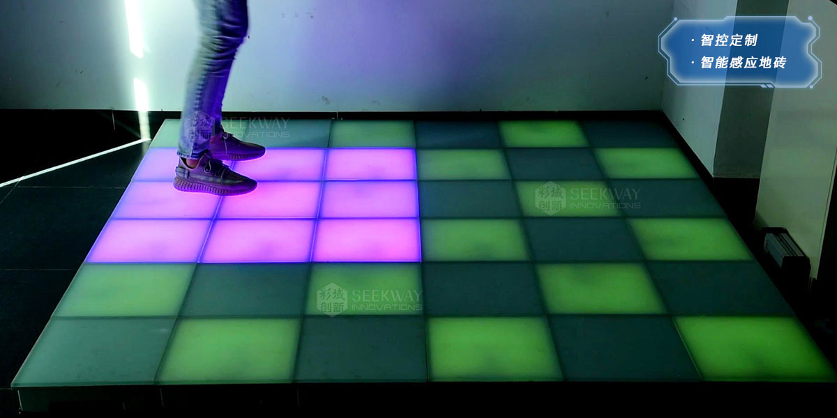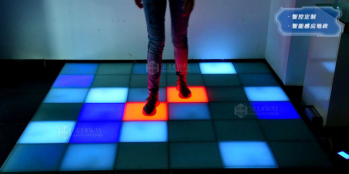 感应脚步轨迹触发互动效果,灯光以触摸点为中心向外扩散,并带动音频设备播放声效。