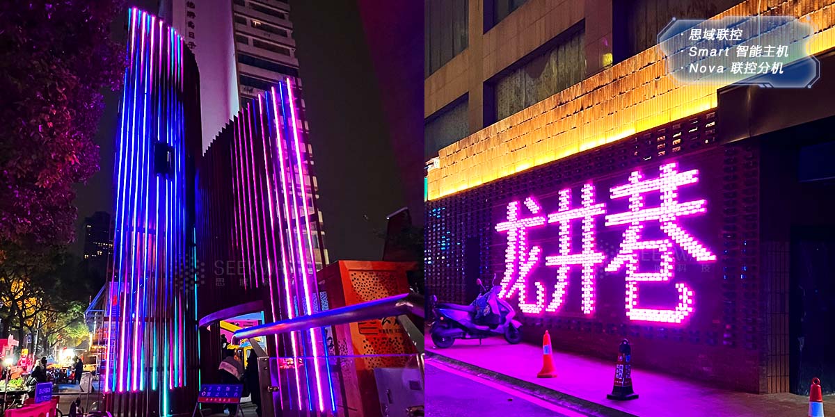 该项目涵盖贯城河的滨河步道和临街美食、潮玩商区等建筑外立面,以及部分灯光装置。在综合考虑现场多种因素后,工程团队采用了【思域联控系统】实现整个街区光影的智能联动,为龙井巷片区注入了新的生机与活力。