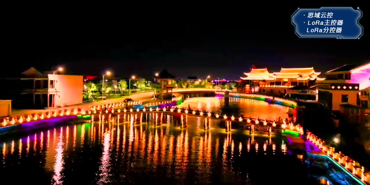 项目利用了LoRa云控系统,凭借无线部署、强抗干扰、实时同步等创新点应用,实现了全场景的夜景亮化,打造 九龙水韵 光影水乡!