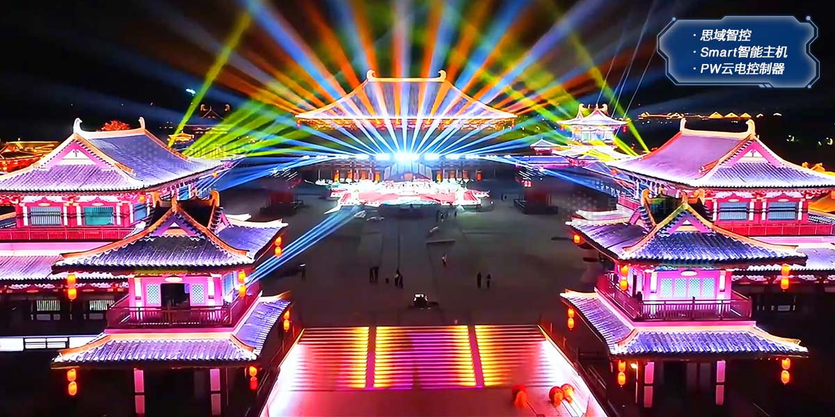 思域科技采用定制智控光影技术,为「山东德州乐陵影视城」铺就星尘画卷,让域内各式建筑在明暗交汇中绽放万千风华!