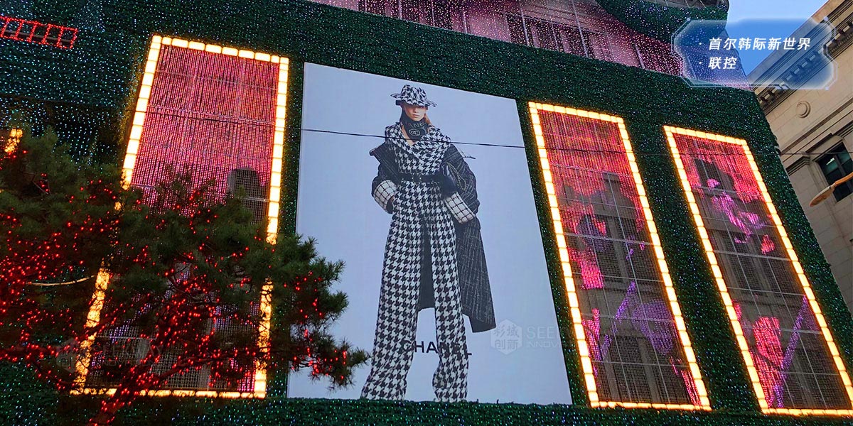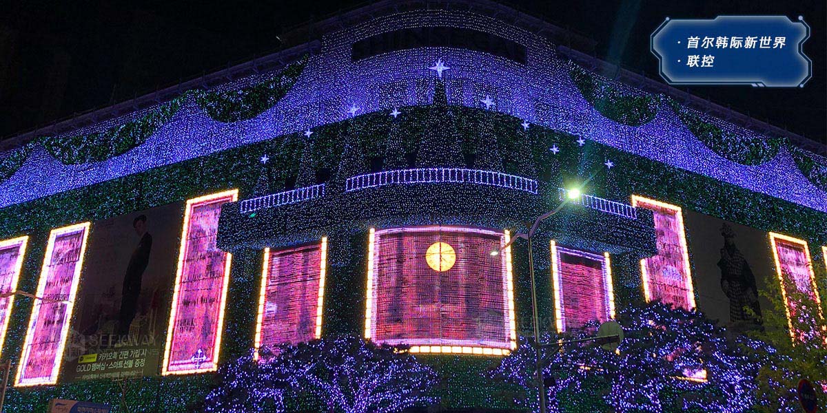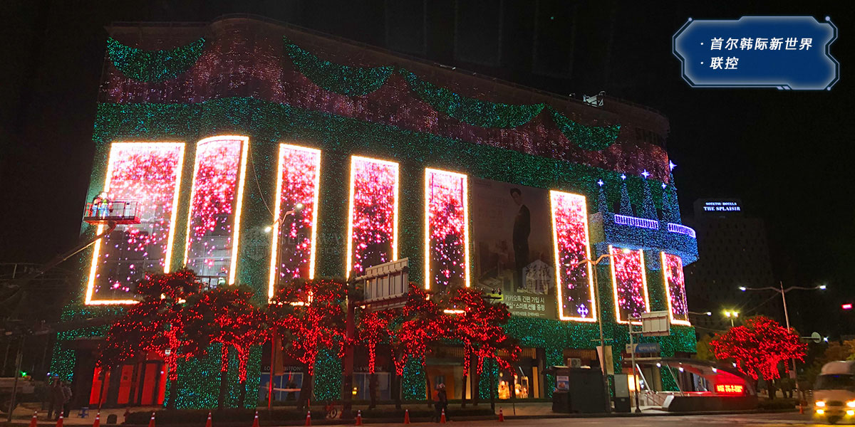本项目用于首尔韩际新世界免税店的夜景灯光装饰。其借助“思域联控”系统,实现了建筑外墙“巨幕”的多区域灯光分屏联动,演绎了以圣诞节等主题的灯光小品,效果优美流畅,给人以眼前一亮的效果。