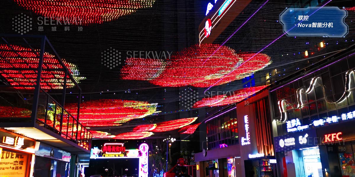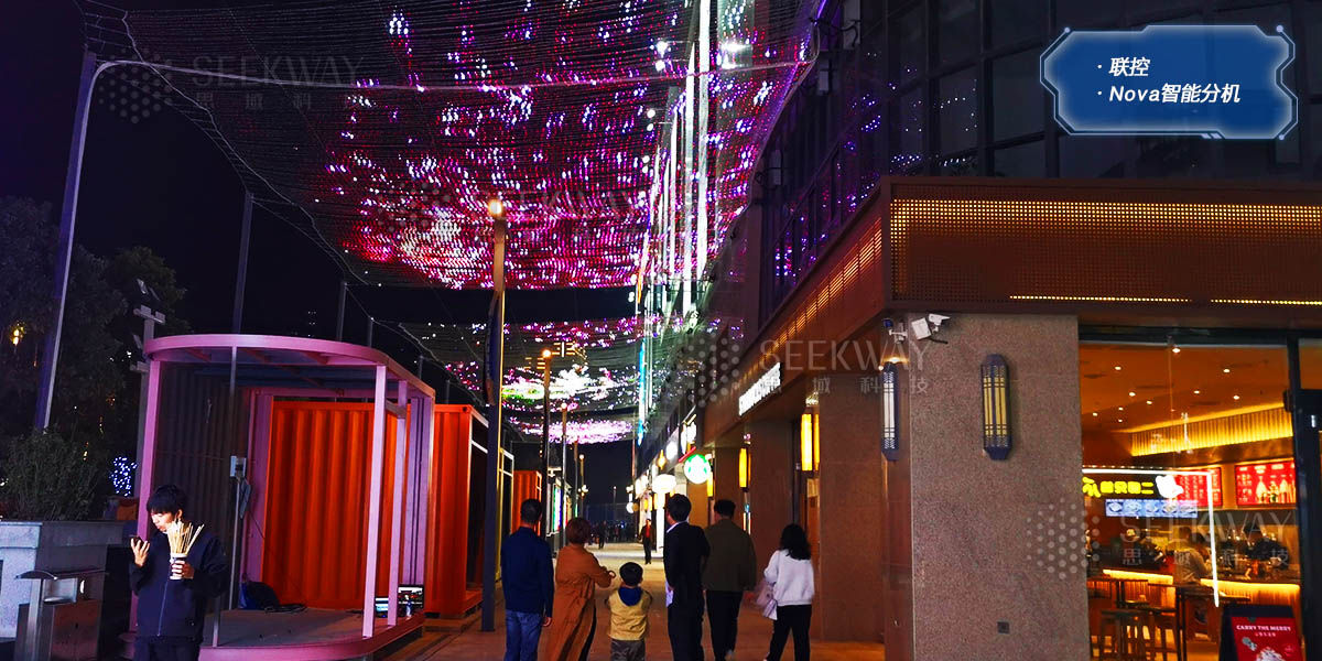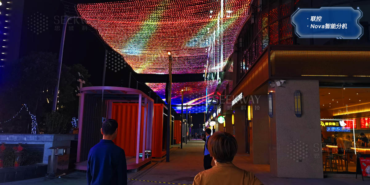 该项目使用了“思域联控”系统。通过采用总服务器+节点服务器的网络架构技术,实现快速、稳定响应的灯光联动效果同时,也支持文字滚动、图片视频展示等等功能。借助“思域联控”系统的强大功能,赋予天幕美轮美奂的光影盛宴,让步入天幕下的行人身临其境,吸引周边游客驻足观赏,从而提高人们消费几率。