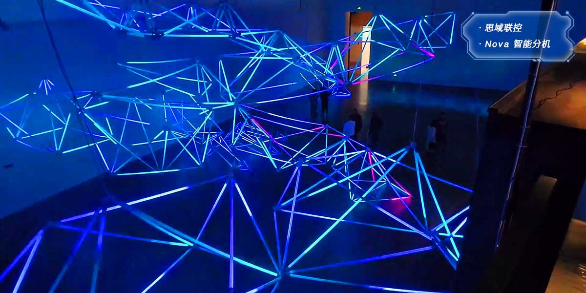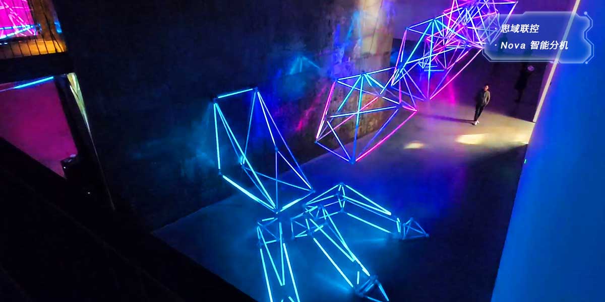 思域联控助力打造宁波美术馆灯光秀,“纹明——沈泳岌个展”,由10分37秒的音乐和43组船型灯光造型组合而成的声、光空间场域作品。
