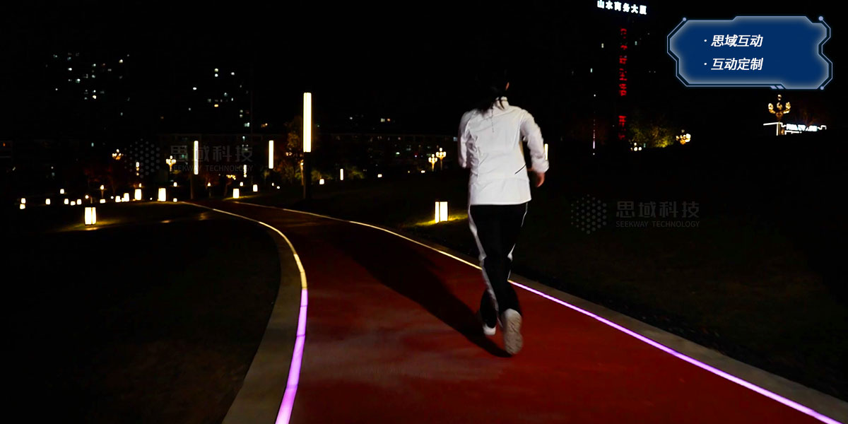 智能光控打造人光互动跑道,脚步触发跑道动态流光,智能光韵晕染湖畔夜境。